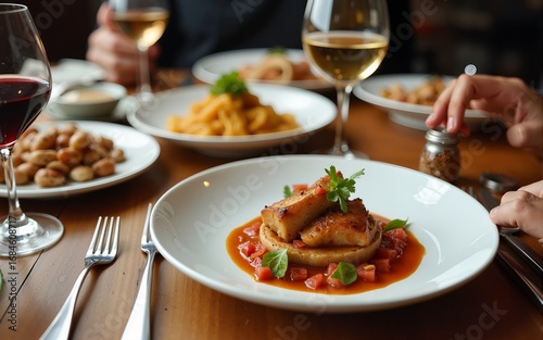beautifully served table with different restaurant dishes and hands with glasses of wine. High quality