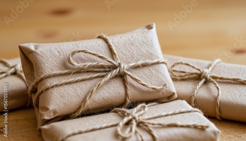 Beautifully Wrapped Gifts with Natural Twine on a Wooden Table for Holiday Celebration