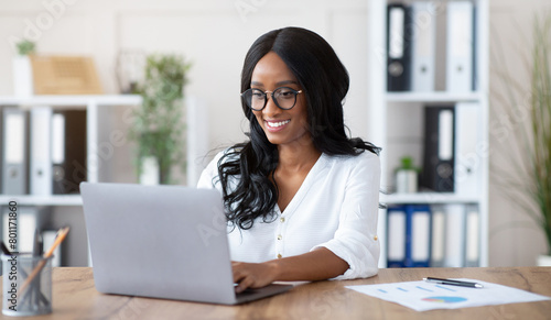 Beautuful black businesswoman working with laptop computer at desk in office