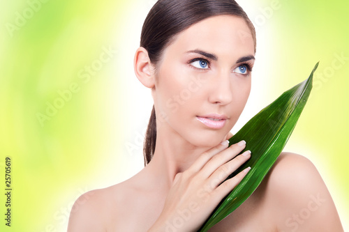 beauty, concept, natural, pure, head, beautiful, woman, green, nature, sensuality, portrait, leaf, face, smiling, care, skin, healthy, gorgeous, female, attractive, fresh, pretty, cosmetic, skincare, sensitive, isolated, cheek, closeup, spa, wellness, young, girl, studio, model, posing, background