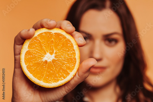 Beauty. Close up portrait of woman holding orange. Beautiful smiling caucasian blurred girl model with natural makeup, healthy smile and glowing hydrated facial skin. Vitamin C cosmetics concept.
