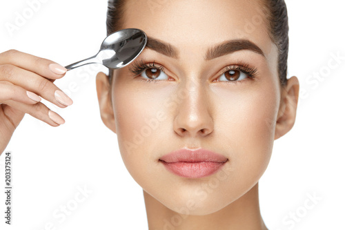 beauty, face, skin, care, woman, spoon, eye, procedure, facial, cold, fresh, cosmetic, treatment, eye, skincare, cosmetic, make-up, soft, smooth, pure, clean, natural, beautiful, young, attractive, female, girl, portrait, closeup, lifting, caucasian, cosmetology, touch, puffiness, wrinkle, dark, circle, health, healthy, high, resolution, model, therapy