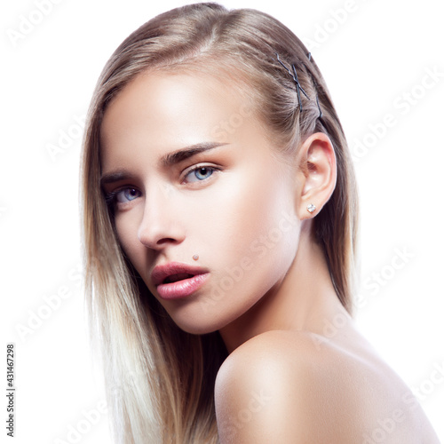 Beauty female face close up with perfect skin, natural make up. Blonde hair, white background, isolated