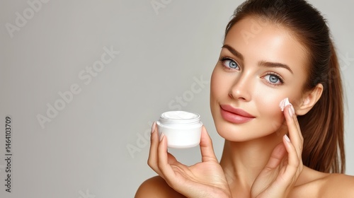 Beauty model applying luxurious facial cream, highlighting smooth skin and professional skincare regimen for glowing, healthy complexion