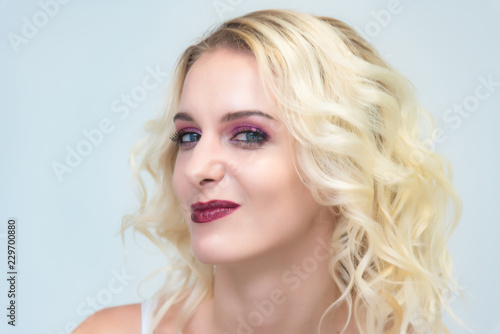 Beauty portrait of a beautiful blonde girl on a white background with perfect makeup.