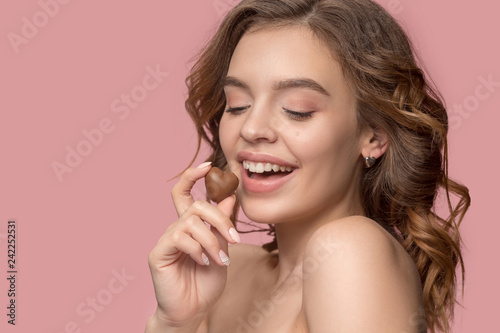 beauty portrait of a cute girl in act to eat a chocolate candy over pink studio background
