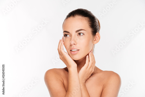 woman, skin, closeup, skincare, adult, glamour, female, touching, girl, shoulder, face, make-up, elegance, background, pretty, spontaneous, isolated, charming, model, natural, attractive, white, bright, clean, cosmetic, caucasian, fashion, away, portrait, cute, smile, lady, healthy, young, care, beauty, looking, sensuality, beautiful, fresh, honed, hand, happy, freshness