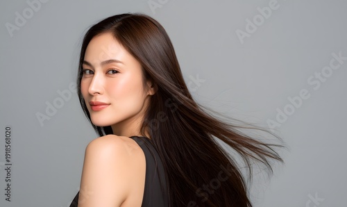 beauty portrait of a young Asian woman, long straight glossy brown hair flowing dynamically behind her