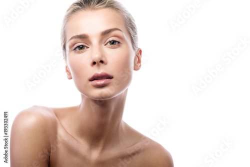 Beauty portrait of female face with natural skin. Beautiful blonde girl with Nude makeup isolated on white background