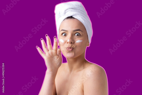 Beauty portrait of woman in white towel on head with a sponge for a body in view of a pink hearе on violet background.