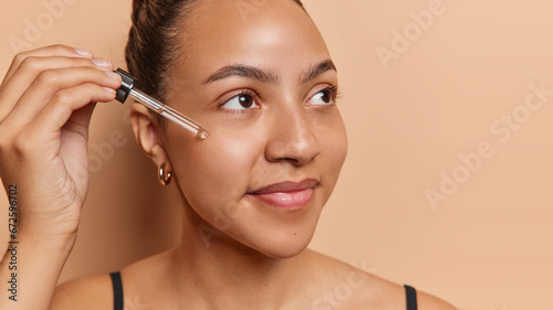Beauty procedure. Studio close up of young beautiful cheerful smiling gently European female standing isolated on beige background in black undershirt applying acid oil for face looking aside