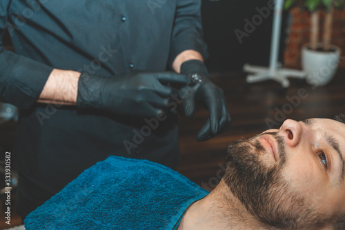 Beauty shop for men. Shaving a beard in a barbershop. Barber cuts his beard with a razor and clipper. close up Brutal haircuts. Hairdresser equipment. Selective focus.
