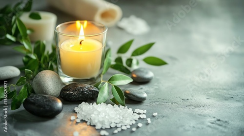 Beauty spa treatment with candles, A serene setting with a lit candle, smooth stones, and fresh leaves, creating a calming atmosphere for relaxation and wellness.