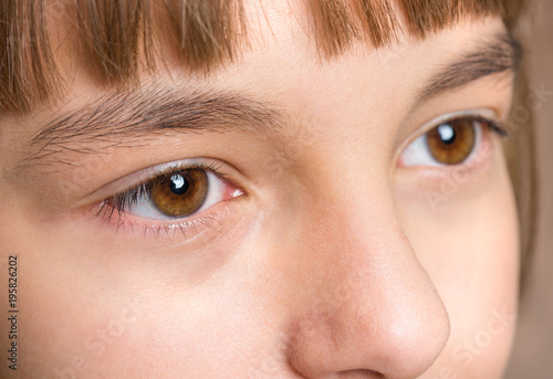 Beauty teen girl face close up portrait. Young cute child with brown eyes, looking away.