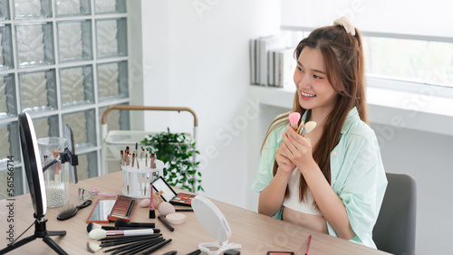 Beauty Vlogger concept, Young woman presenting different makeup brush and introduce product on Vlog