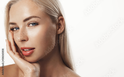 Beauty. Woman 25 years, has shiny glowing skin, clean nourished body and face, looks sensual at camera, eyebrows sick with brow gel, white background