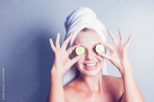 Beauty Youth Skin Care Concept - Portrait Beautiful Caucasian Woman apply cream and holding fresh cucumber in front of her face.Isolated over white background.