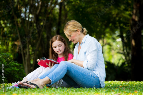 beautyful Mother and cute daughter are reading a book and smile at the park . Happiness and harmony in family life concept.