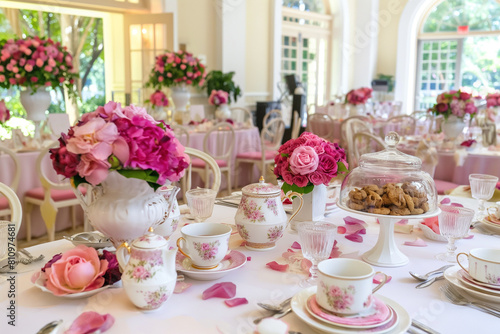Bed set for afternoon tea with pastel pink, blue, yellow and green tea set. Tea party