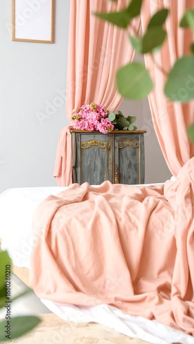 bedchamber, interior, design, decor, cosy, home, pink, flower, furniture, bed, drape, soft, texture, elegant, stylish, light, calm, warm, modern