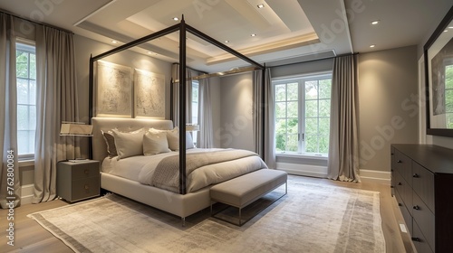 Bedroom with a serene palette of soft lavender and gray, a canopy bed, and recessed ceiling lights
