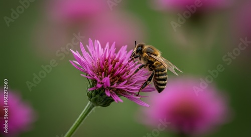 Bee collecting pollen from pink flower. Insect on blossom. Nature outdoor concept for gardening, biology, and ecology.