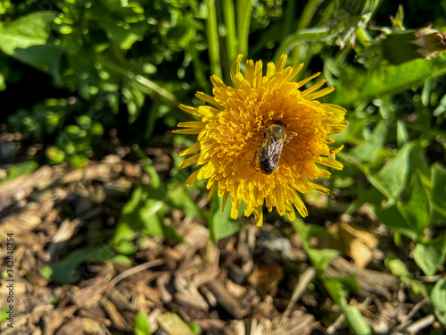 blowball, animal, summer, pollination, macro, nature, nectar, plant, spring, insect, field, meadow, bloom, floral, flower, garden, closeup, bee, honey, working, yellow, fly, sweet, tied-up, green, close, collect, health, healthy, cute, flower petals, blossom, wildlife, enjoy, active, single, outdoors, small, beauty, freshness, detail, elegance, leaf, grass, background, blooming, season, wildflower, honey bee, image