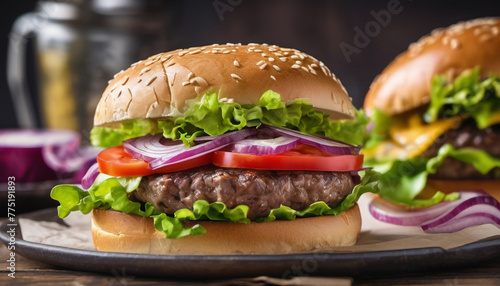 Beef burger with red onion, tomatoes and lettuce close up, ai