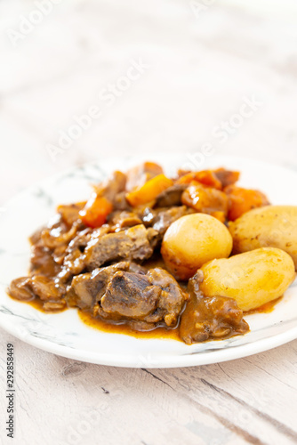 Beef meat stewed with potatoes-Traditional French cuisine Beef Bourguignon potatoes carrots in persillade