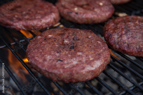 Beef or pork meat barbecue burgers for hamburger prepared grilled on bbq fire flame grill