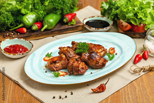 Beef shashlik pieces grill on a plate. Restaurant, Cafe, lunch.