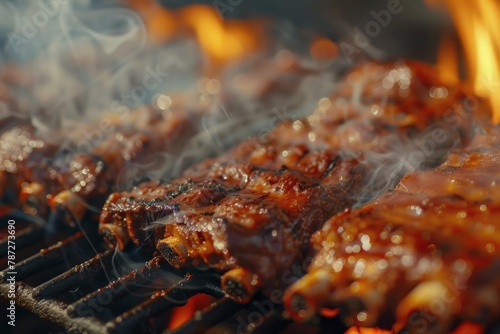 Beef short ribs on the grill close up of meat with smoke. Generate AI image