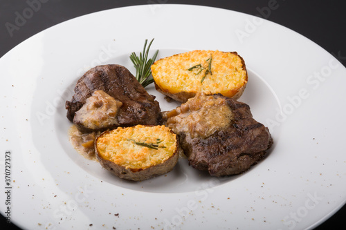 baked, potato, rosemary, garnish, medallion, homemade, courgette, culinary, organic, marinated, chop, protein, herb, grocery, epicure, fillet, cut, bar-b-q, prepared, grill, cookery, delicious, juicy, fresh, sirloin, tenderloin, steak, beef, grilled, meat
