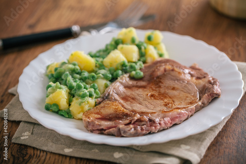 beefsteak, beef, fillet, bar-b-q, cooked, food, grilled, meal, meat, meat dish, pea, potato, roasted, rosemary, sirloin, steak, tenderloin, vegetable, vegetable, wooden