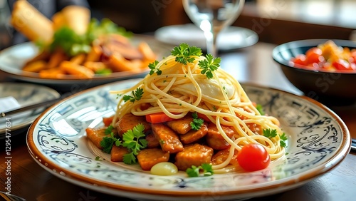 food, pasta, meal, dinner, spaghetti, dish, plate, cookery, italian, lunch, vegetable, sauce, delicious, meat, salad, tomatoes, epicure, healthy, noodle, green, white, chicken, basil, eatery, seafood