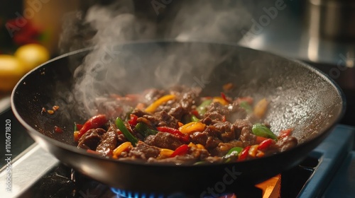 Beef Stir Fry with Colorful Mixed Vegetables Sizzling in a Wok on Stovetop with Steam Rising and Vibrant Colors