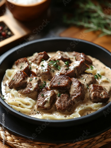 Beef stroganoff over pasta in creamy sauce garnished with herbs.
