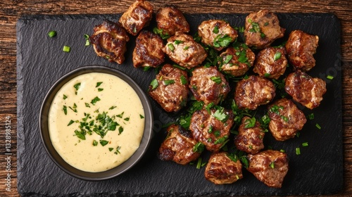 beef, tendon, crispy, fried, platter, slate, dipping, sauce, garnish, savoury, chewy, texture, food, dish, meal, protein, meat, seasoning, herb, spice, wood, rustic, presentation, indulgence, snack, sharing, delicacy, favor, culinary, cookery, cooking, comfort, tradition, artisanal, epicure, premium, appetising