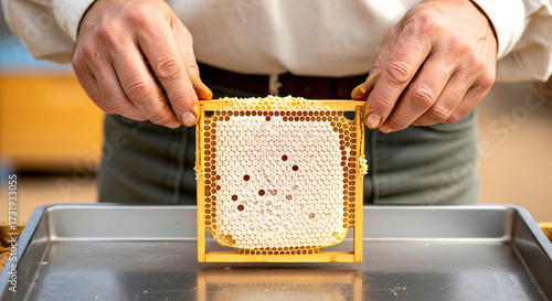 apiarist, hand, honeycomb, honey, wax, hive, apiculture, apiculture, farm, farming, agriculture, natural, organic, fresh, raw, gold, yellow, sweet, ingredient, food, healthy, product, production, harvest, apiary, frame, wooden, work, professional, job, trade, outdoors, detail, closeup, sharpened, health, wellness, process, insect, bee, biology, structure, pattern, geometry, liquid, gold, sugar, delicious, nature