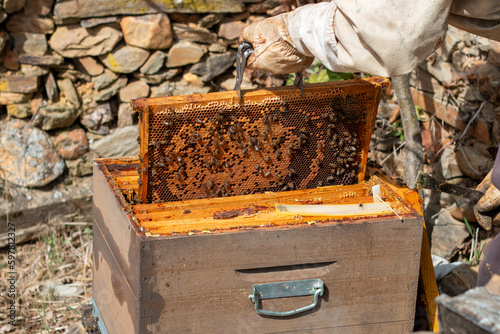 Beekeeper working in the hives. You can see the honeycombs, pictures and other details of the habitat of honey bees