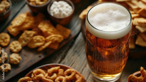 Beer. Alcoholic malt drink. A glass of beer with various snacks such as chips, crackers, nuts. Oktoberfest. Beer festival
