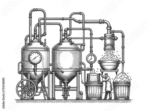 Beer brewing process factory equipment with beer brewing elements and grains. Sketch engraving generative ai raster illustration. Scratch board imitation. Black and white image.