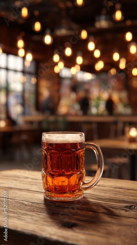 Beer Mug on Wooden Table in Lively Bar With Warm Lights and Blurred Customers Enjoying the Ambiance.