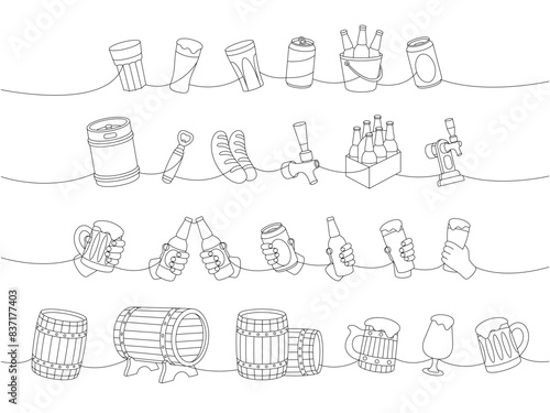 beer, craft, oktoberfest, pub, bar, brewery, 1, line, illustration, design, vector, isolated, hand, symbol, drawn, vignetting, banner, contour, drawing, outline, continuous, silhouette, linear, line art, glasses, eatery, bottle, equipment, beverage, alcohol, pint, drink, lager, party, hop, holiday, ales, menu, festival, brewing, element, mug, set, barrel, keg, doodle