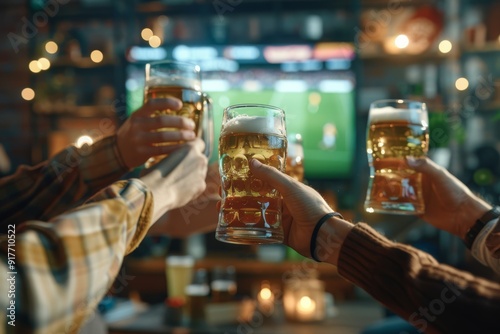 friends, beer, toast, clinking, mug, soccer, match, television, screen, celebration, camaraderie, excitement, watching, game, together, closeup, group, sport, cheering, happy, casual attire, indoor, fun, enjoyment, beverage, alcohol, relaxing, leisure, social, gathering, fan, friendship, television, drink, pub, bar, young, male, female, joy