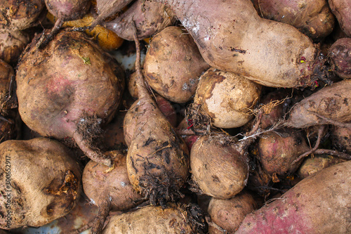 beet harvest beetroot (many fruits of beets that just dug from the ground) concept. food background. copy space. Top view