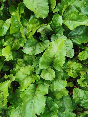 Beetroot leaves texture. Close up photo of green foliage in garden. Background for vegan menu, presentation about nutrition and healthy food