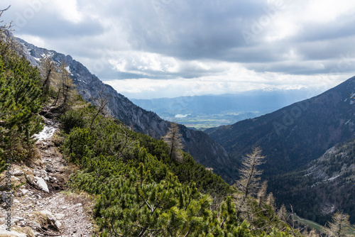 Begunjščica panorama of mountain trekking to the highest peak. View of the Alps, climbing with via ferrata. Distant view of Lake Bled from above. Sports holidays, life of adventure in the countryside