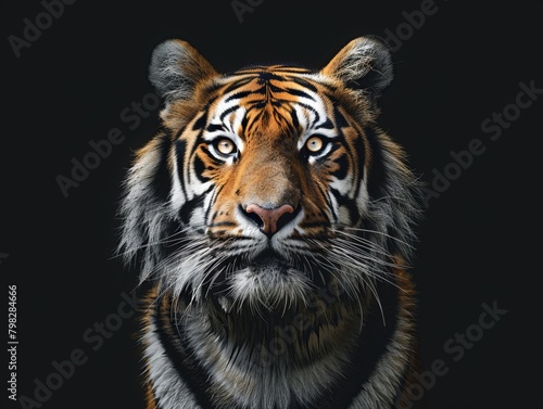 Behold the majestic presence of a tiger, its powerful gaze piercing through the darkness of a black background. In this captivating portrait, the tiger's regal demeanor is highlighted
