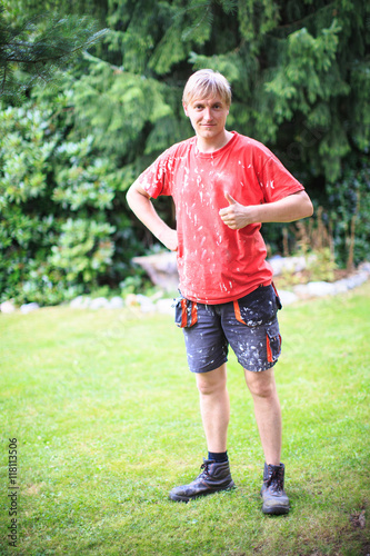 gardening, house-building, craftsman, craft, cool, thumb, security, credit, control, property, outdoors, standing, business, teamwork, work, payment, build, painter, rebuild, renovate, fashion, occupation, working, confident, contented, professional, housework, photogenic, renewal, improve, young, man, male, home, cooperation, recreation, casual clothes, adult, break, construction worker, workwear